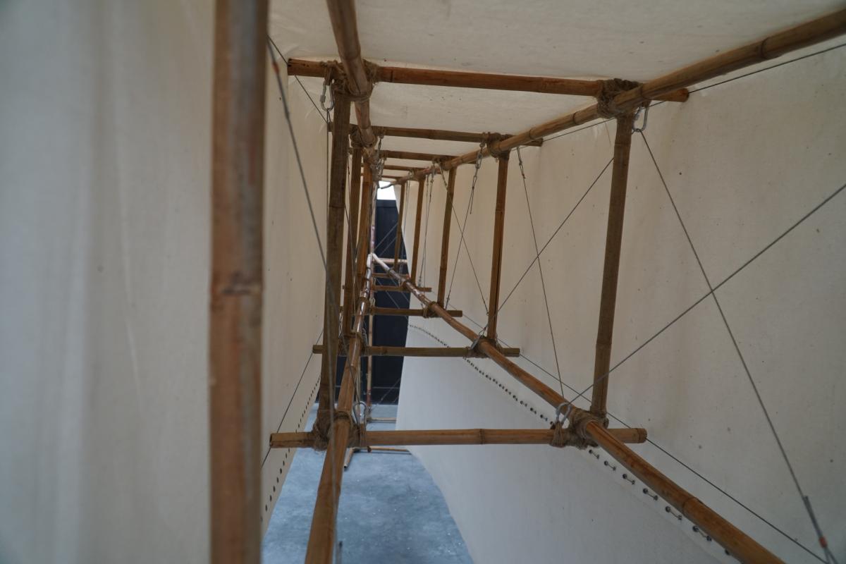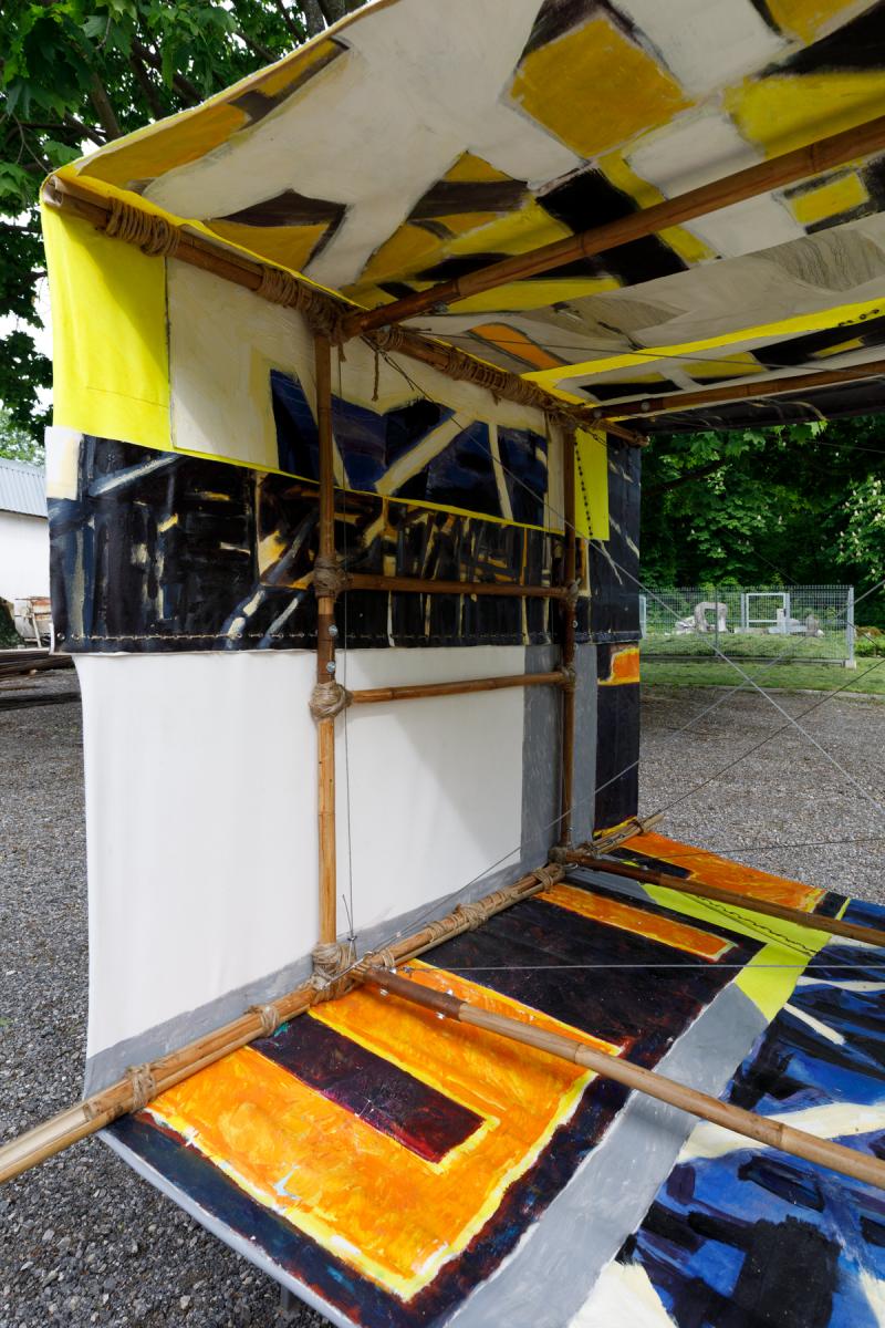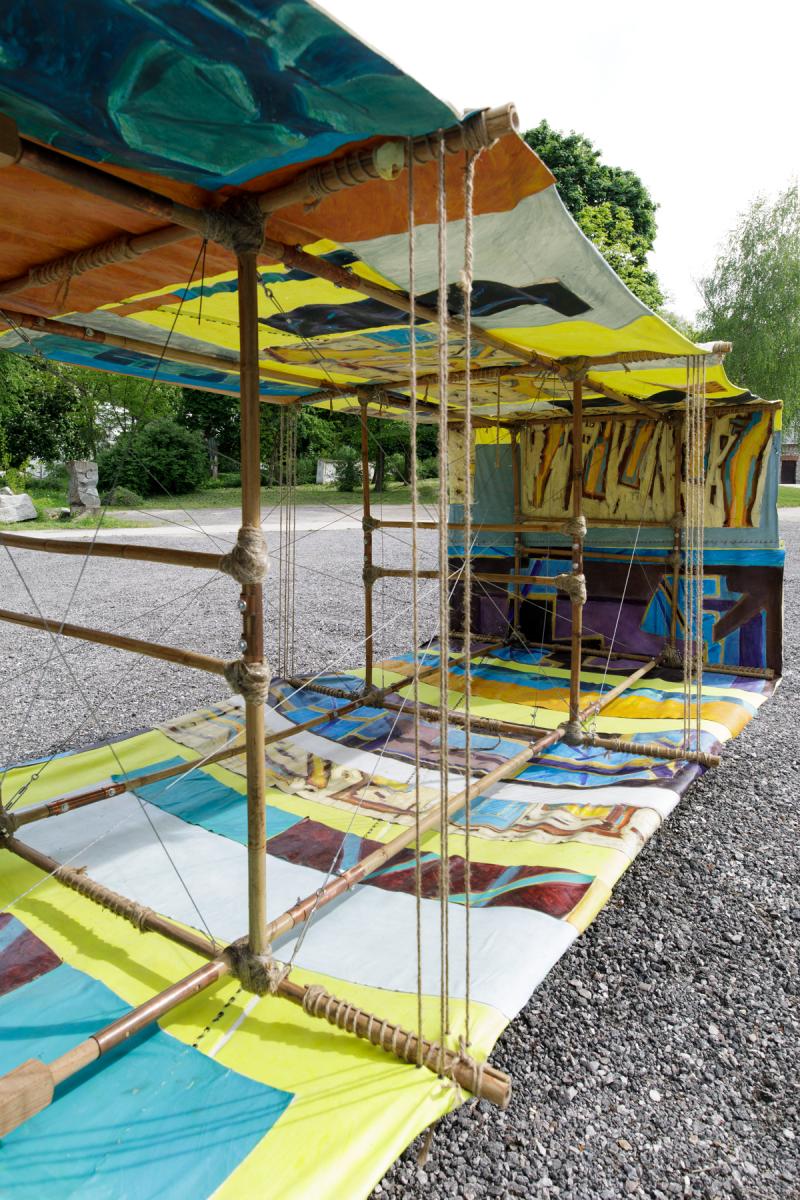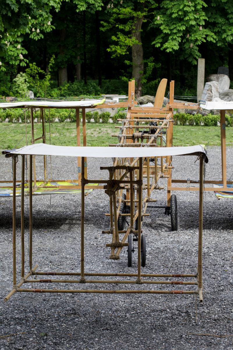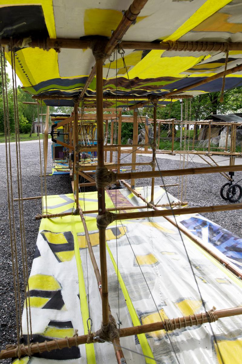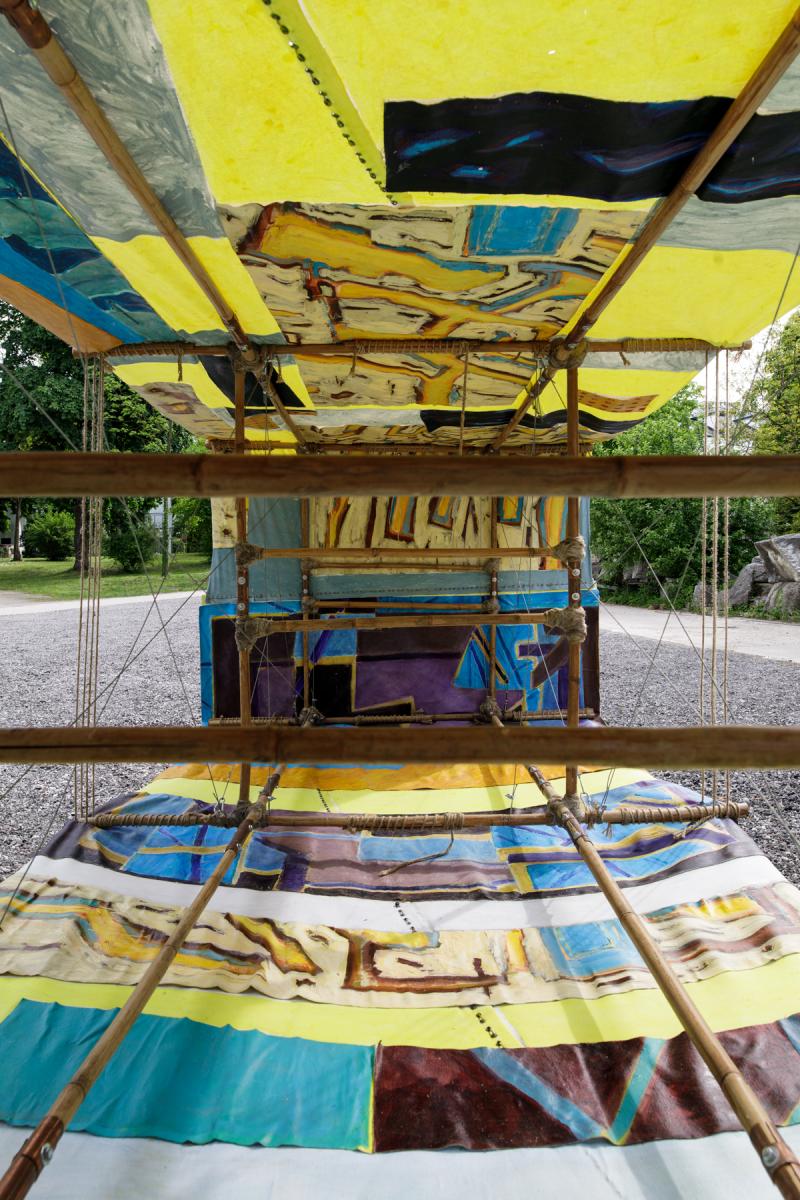 A-21. The Machine for Vanishing” is an aeroplane made of bamboo and paintings. The machine explores the ambivalent human relationship with physical reality and nature. At the same time the object aims at capturing the primal elements and immersing ourselves in them.