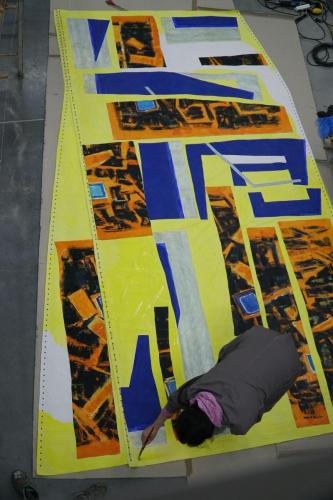The structure of A-21 is inspired by the construction of 14 BIS created by Alberto Santos Dumont in 1906. Dumont was an utopian idealist who believed that aviation would eventually connect the world and that the borders would disappear. The talented inventor comitted suicide when aviation began to be used for military purposes. A-21 is a new object with some parameters of 14 BIS changed. Instead of silk used in 14 BIS, Marta Kawecka used patchworks of her paintings to cover the wings. Paintings remain the emotional memory and had originally been composed from different textures, structures and layers.