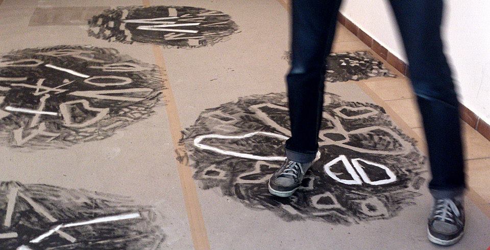 The installation consisted of drawings, sound files and Kinect software. There were drawings on the flor – stains of tangled signs inspired by words invented by Miron Białoszewski. When the viewer stopped on, stepped onto the spot, the fragments of the poem selected by the program could be heard. When he stayed longer on the spot, the drawn word repeated with a change intonation. The installation could be visited chaotically, entering the drawings in a random way, or recreating the entire poem clockwise. Ending – the puch line always played the same way. When there were several people in the room, the fragments of the poem overlapped and looped, so that an orderly reading of the poem became almost impossible, The difference between visiting an installation alone or in a group corresponds to the difference in perception of the world, states that we experience when perceiving stimuli alone or in the company of many, often random people.