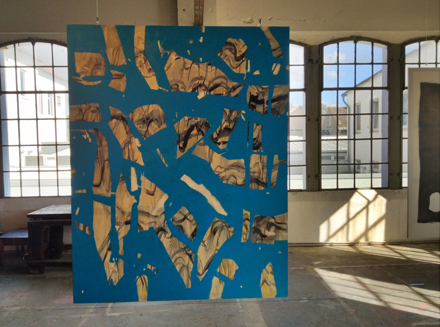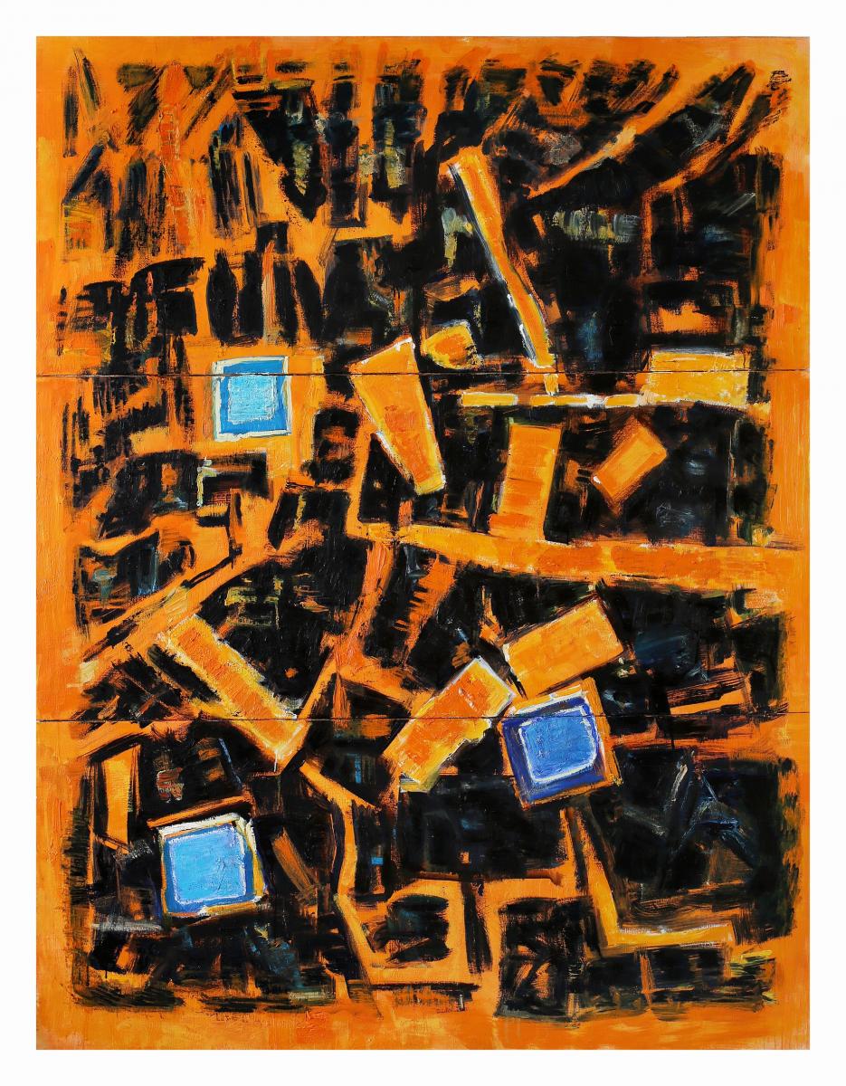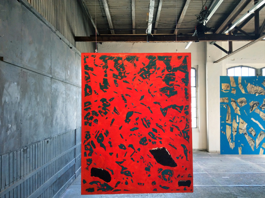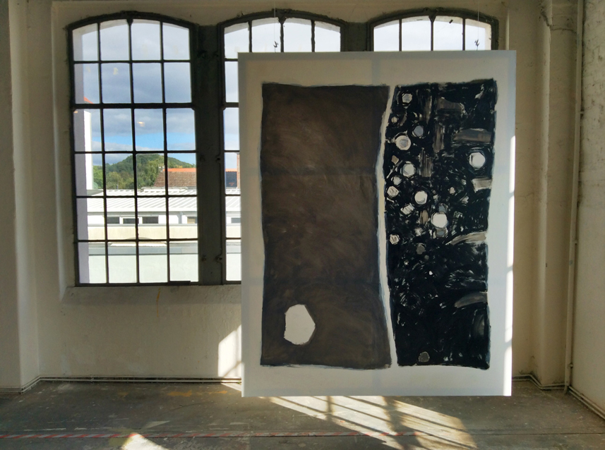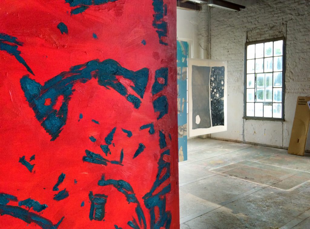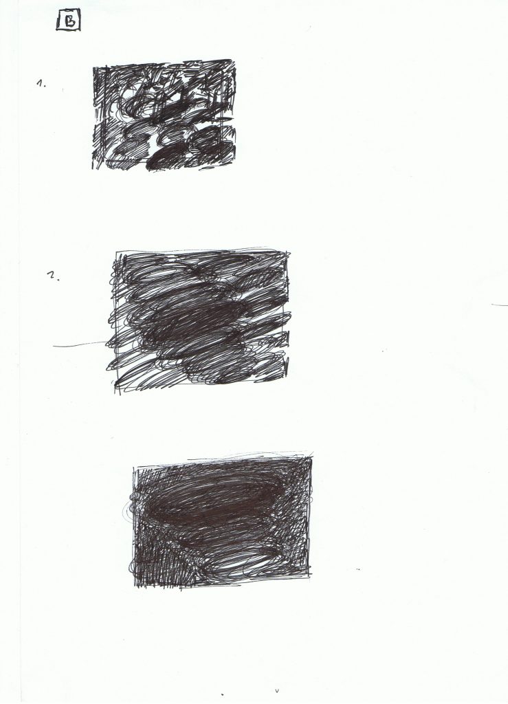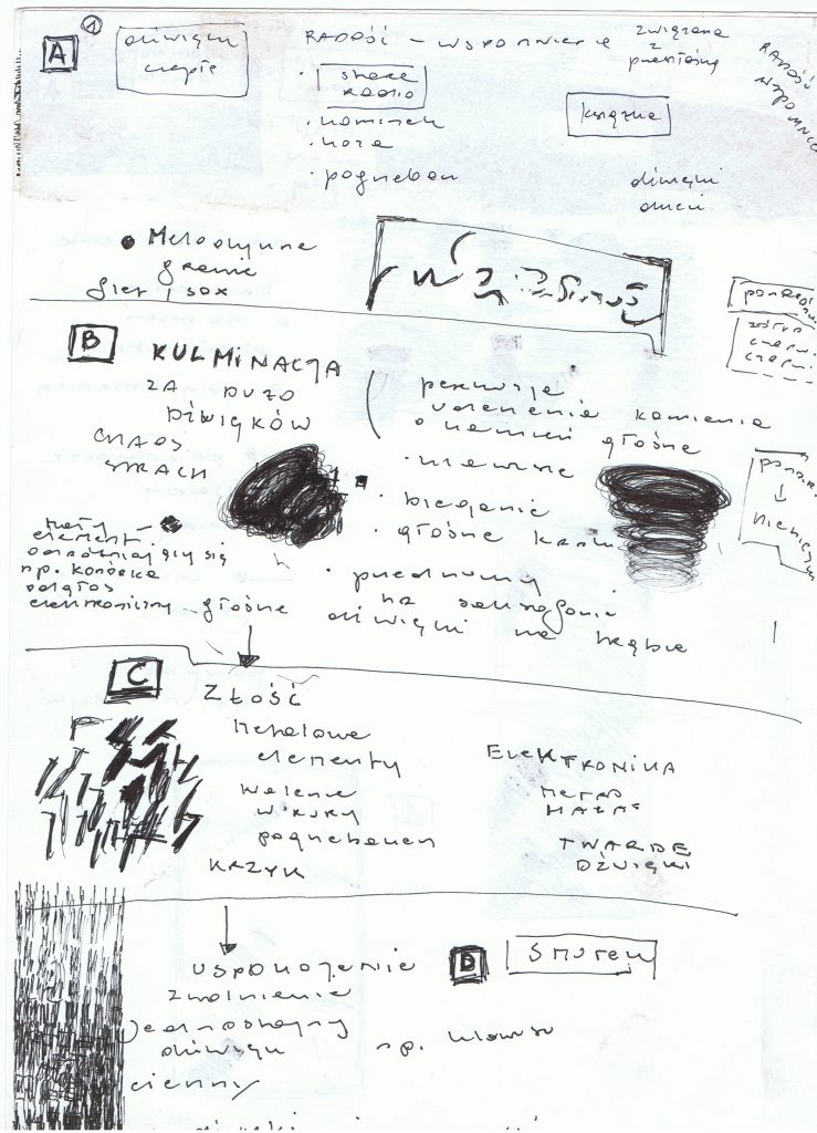 The images and the sound composition were created in parallel. Concepts such as timbre, density of texture, dynamics, tension/dissonance, rhythm, dominant are concepts common to both arts, which facilitated the work. I wrote down my sound ideas using drawings, which later served as scores for musicians. We divided the obtained sounds into four groups – drone sounds (single, low, repetitive, usually with a constant pitch), aggressive, rhythmic and neutral sounds, and we constructed the sound space in layers. Like collages that were sketches for paintings.​